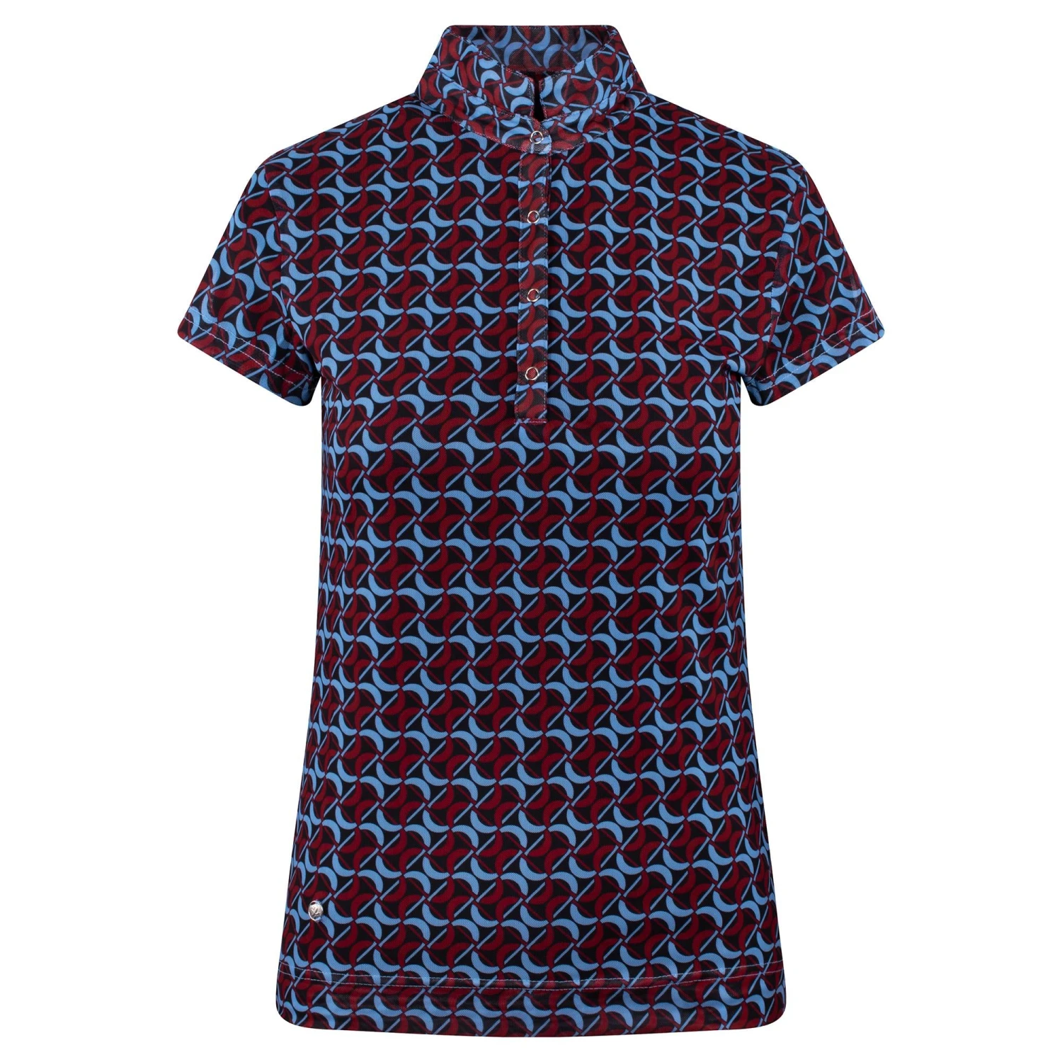 The Airdrie is a short-sleeved top from Daily Sports which features an eye-catching all over soft shaped graphic print in black, belle blue, and umbria red. The Airdrie is cut in a slim fit and features a low stand-up collar with snap buttons. The jersey is made from a cool and stretchy mesh fabric that dries quickly, making the Airdrie the perfect top for all seasons.
