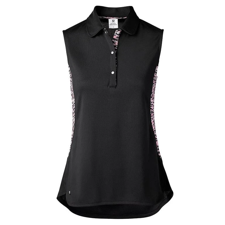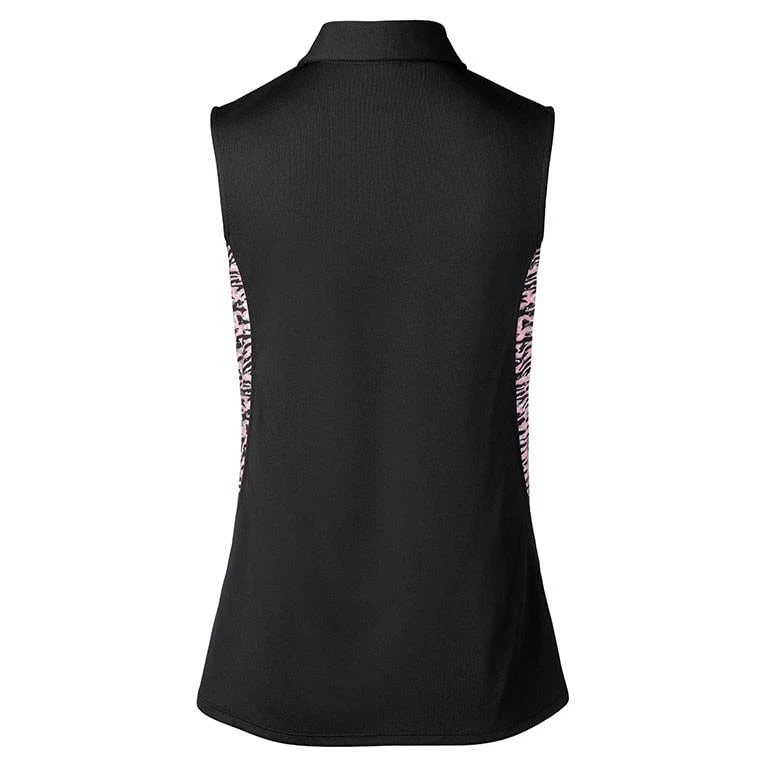 Beth by Daily Sports is a sleeveless golf top in stretch Quick Dry material. Button front. Mesh print details at the sides, inside the collar and placket. Flared fit. Slightly looser style.