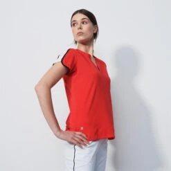 The Clichy is a short-sleeved top is a new ladies golf polo from the Daily Sports SS23 collection. This stylish polo delivers both an elegant and sporty look, combining a stylish design with contrasting panels on the sleeves as well as an eye-catching edge trim around the V-neck. The woven fabric adds texture and is also cool and moisture-wicking, perfect for summer and also ensuring additional comfort both on and off the course.