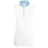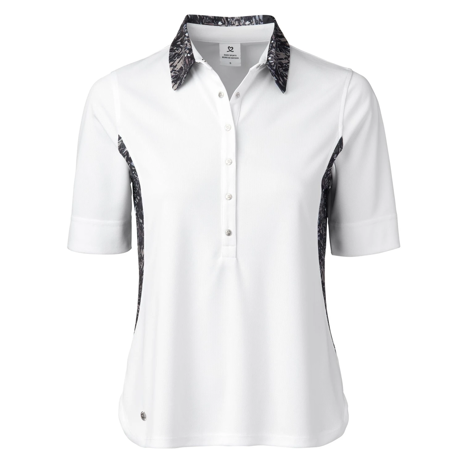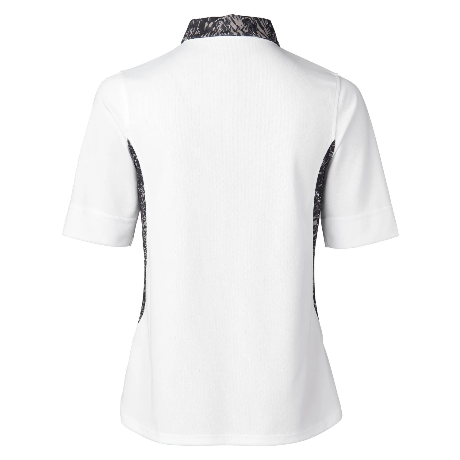 Luna by Daily Sports is a short-sleeved golf shirt with slightly longer sleeves. Stretch textured Quick Dry material. Graphic print mesh fabric on collar and sides. Long button placket to front with small press-studs. Small side slit for a feminine look. Regular fit with slightly fitted waist.