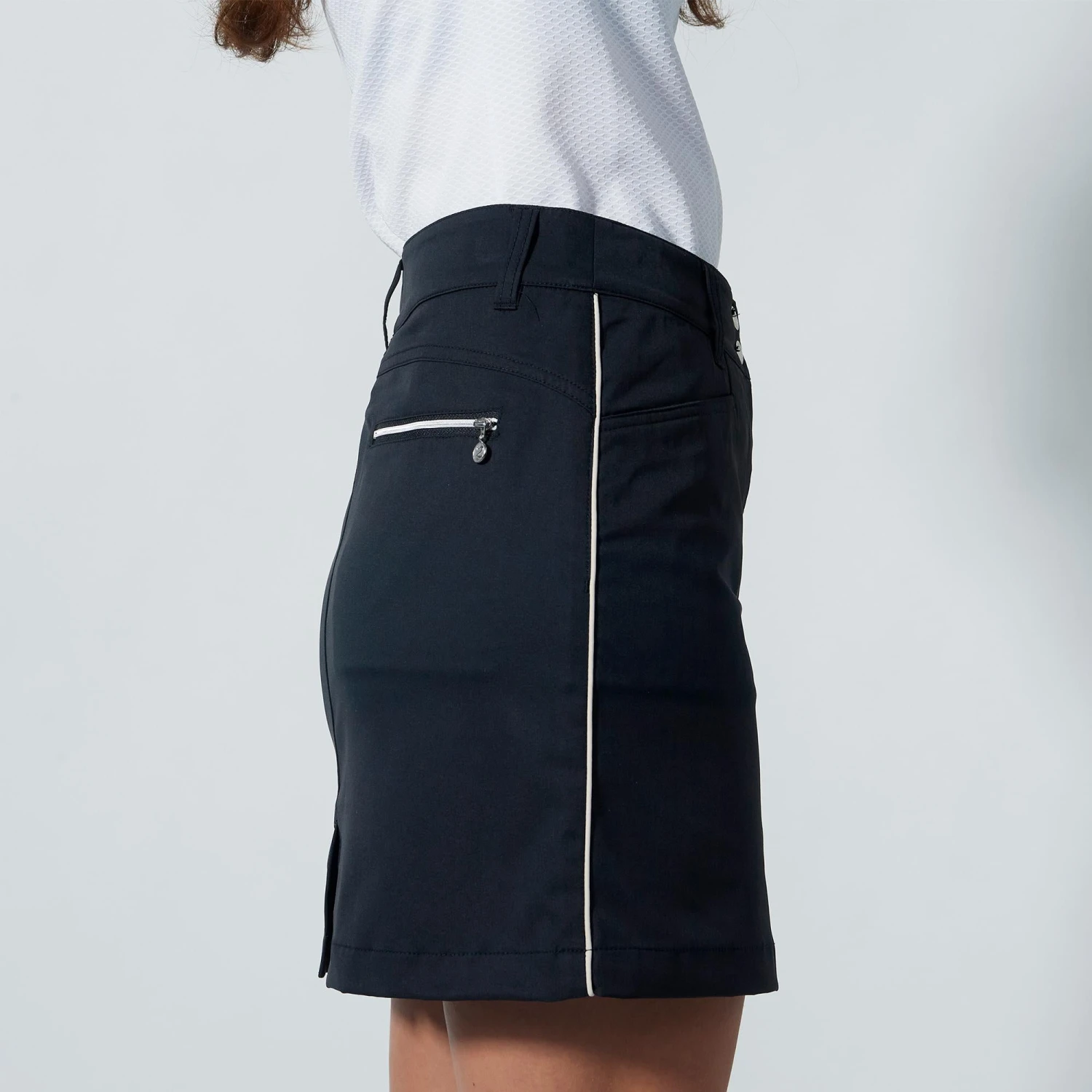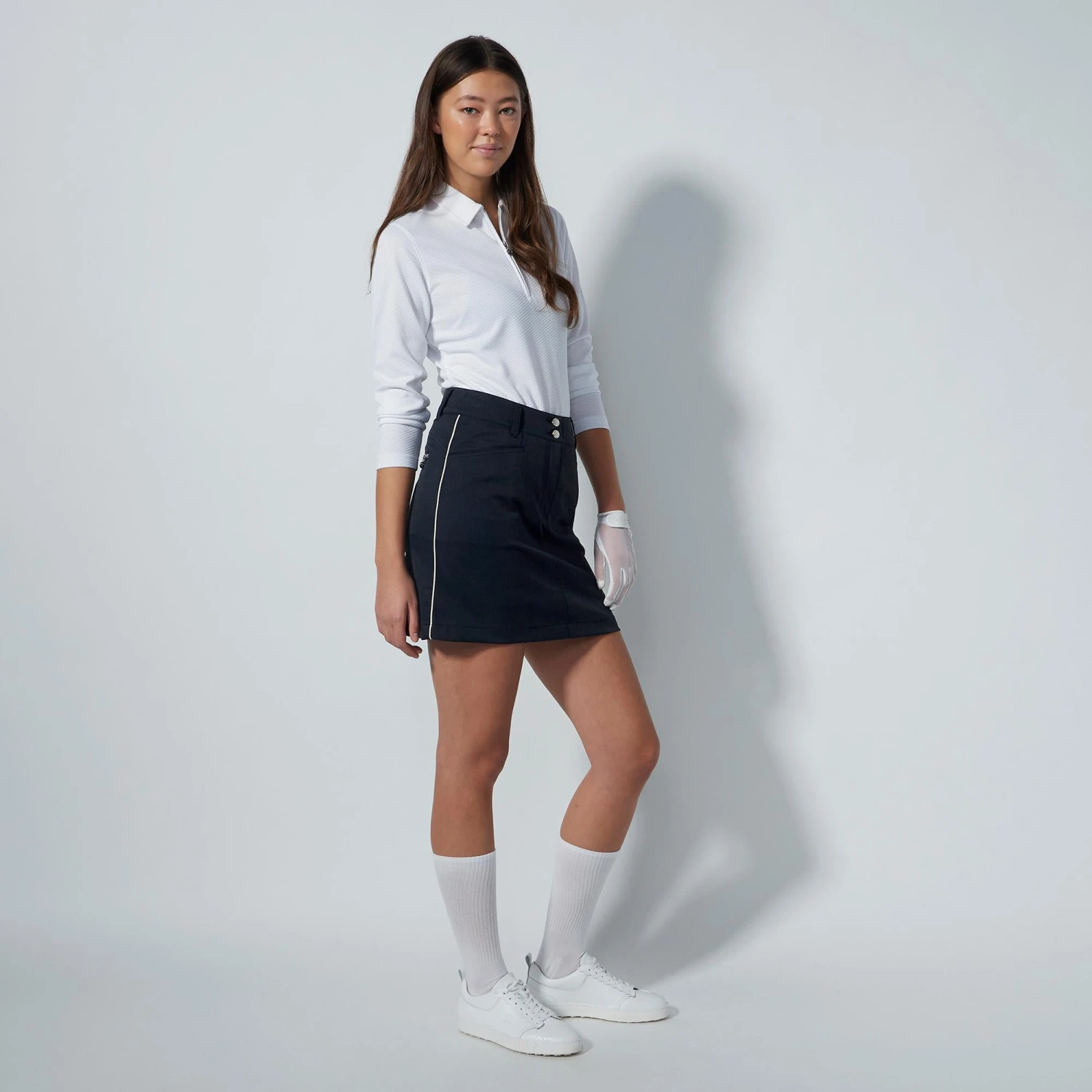 The Daily Sports Glam Skort is a classic skort that forms a key part of any look, all year round thanks to its versatility and signature contrasting silver piping along the side-seams which provide an eye-catching look. The stylish Glam skort is crafted from stretch fabric that includes wind-resistant, quick-dry and wrinkle-free among its many attributes. Also featuring two straight front pockets and 2 zipped back pockets, all with branded Daily Sports zippers, that guarantee functionality. This versatile skort pairs easily with Daily Sports ladies polo or mid layer to form an eye-catching, go-to look for both on and off the golf course this season.