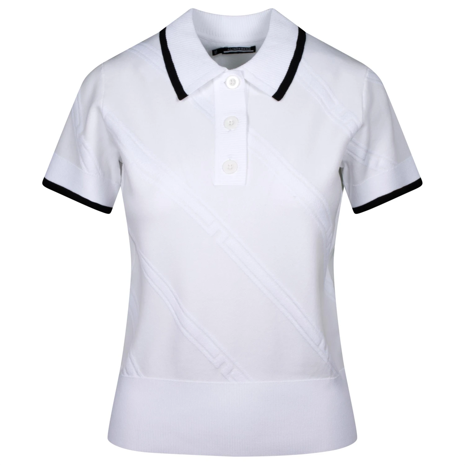 The J Lindeberg Feline is a new season sensation with an imaginative twist on a short sleeved polo/sweater , It has a sporty look with a textured double knit high and low jacquard artwork with ribbed collar , cuffs and hem which makes it a compelling choice