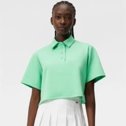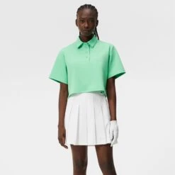 The Iris cropped stretchy boxy top from J. Lindeberg features a press button on collar and raised J.Lindeberg print on back. This fashionable top is crafted from 4-way stretch material and features a 4-button placket with press buttons. The slits at the sides also add to the Iris’ look. This unique ladies golf top is sure to turn heads both on and off the golf course. Elevate your look by pairing the Iris top with the Asa compression to stand out on the fairways!
