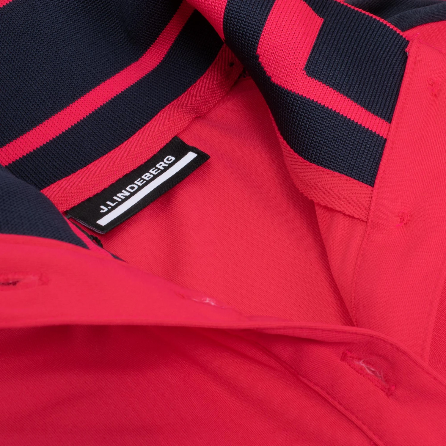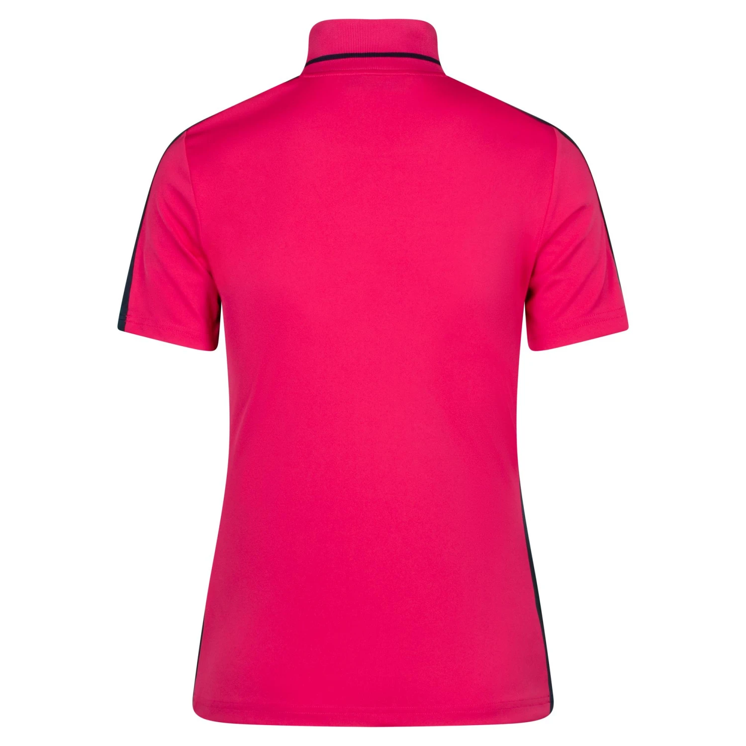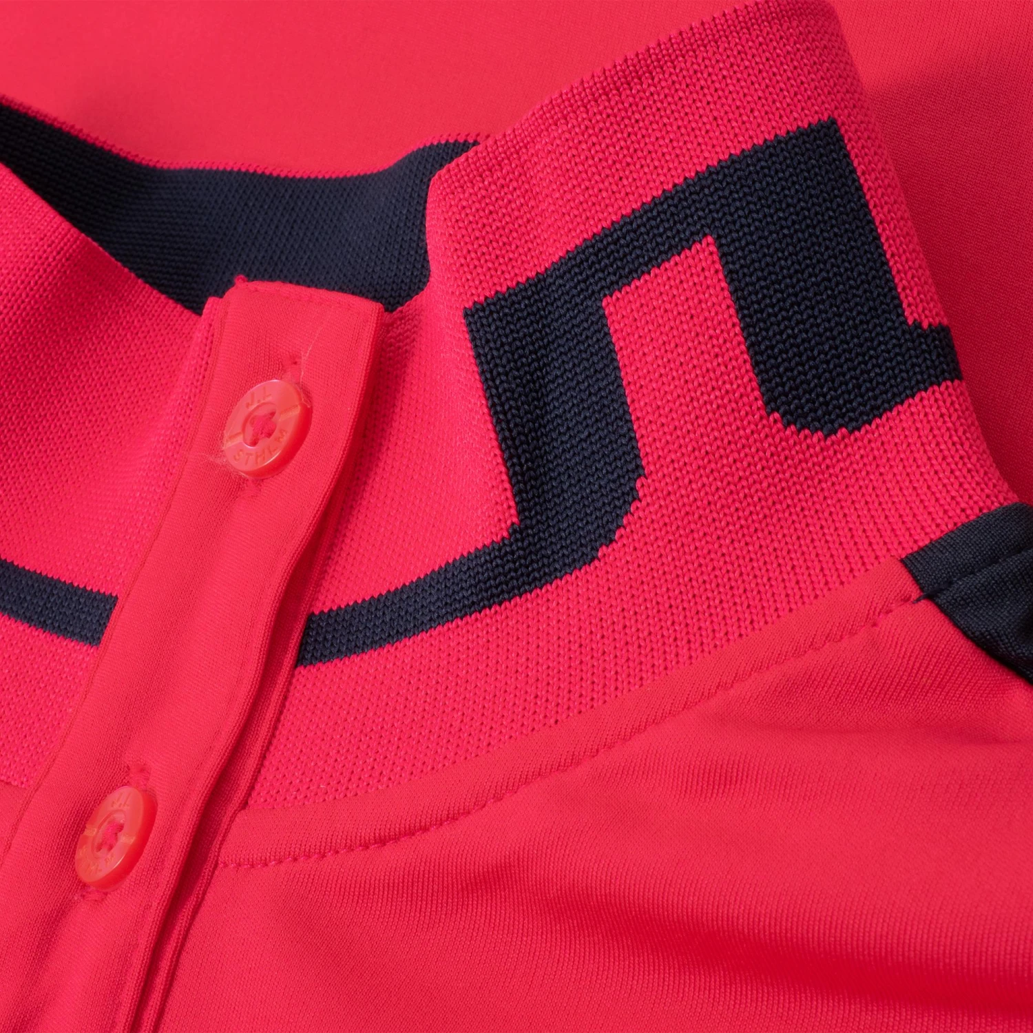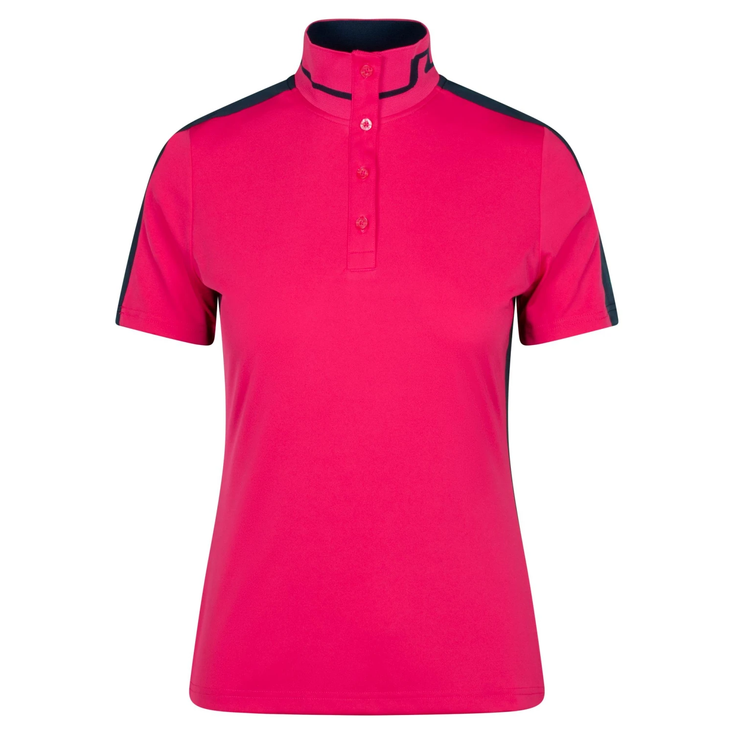 The J Lindeberg Pip polo is one of our favourites , designed with a feminine high neck rib collar which can be worn buttoned up or down, contrast side panelling across the shoulders and sides and finished with a modern jacquard rib collar with JL bridge artwork