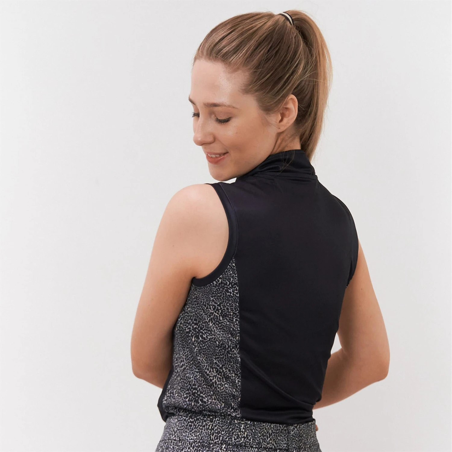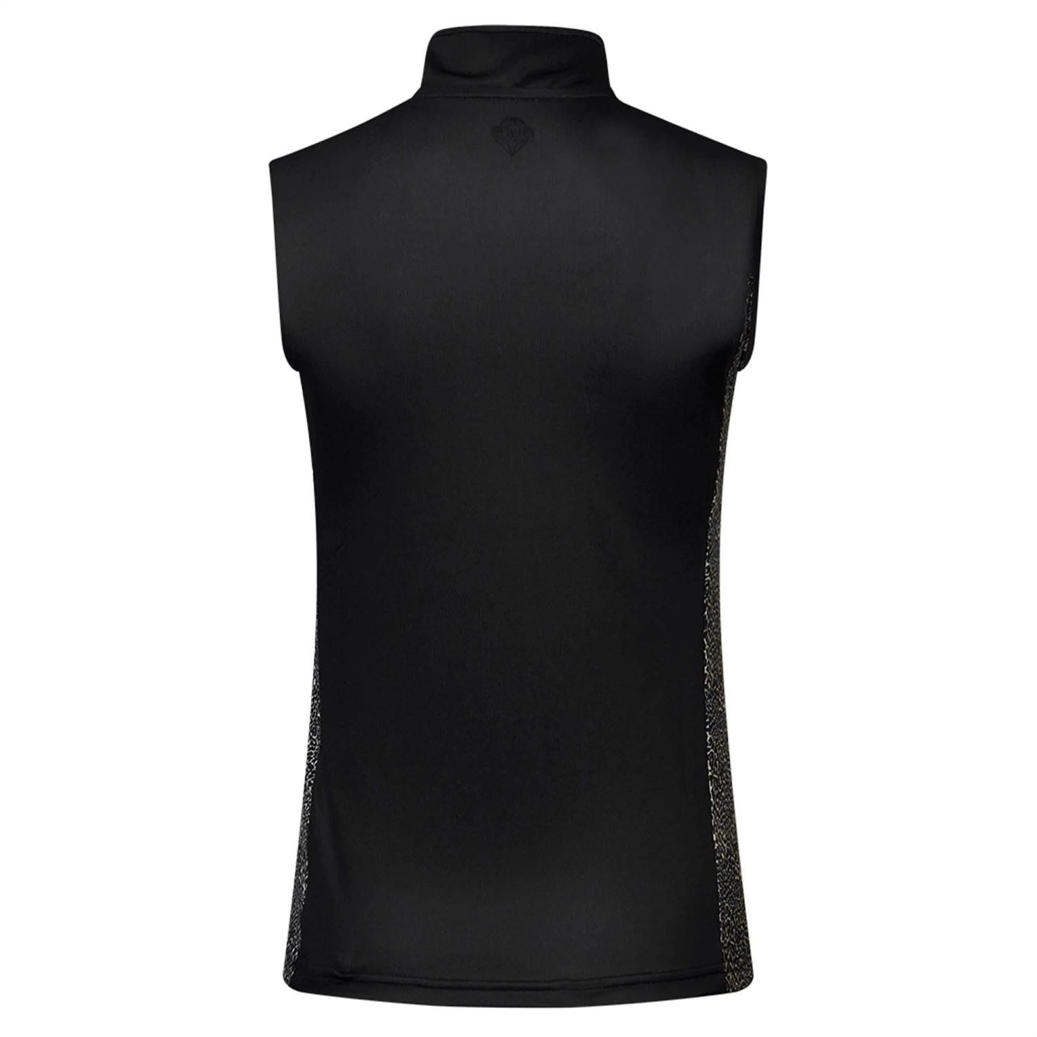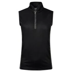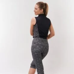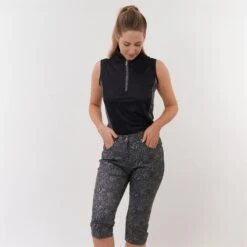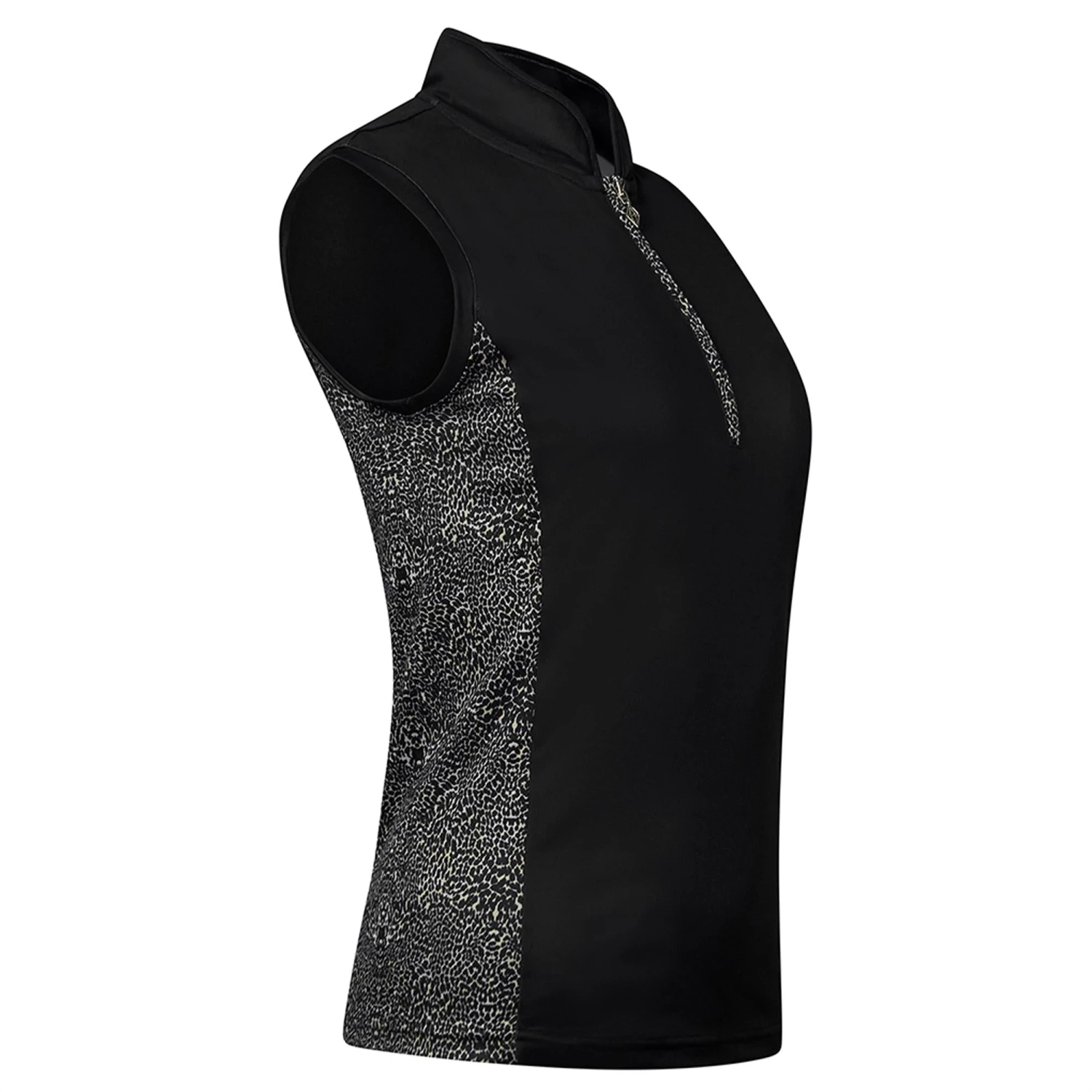 Elise is a partially printed sleeveless polo shirt made from anti-static, anti-crease, 4 way stretch and quick drying fabric with built in UVA+UVB sun protection with UPF 35 to block harmful rays on the course.
