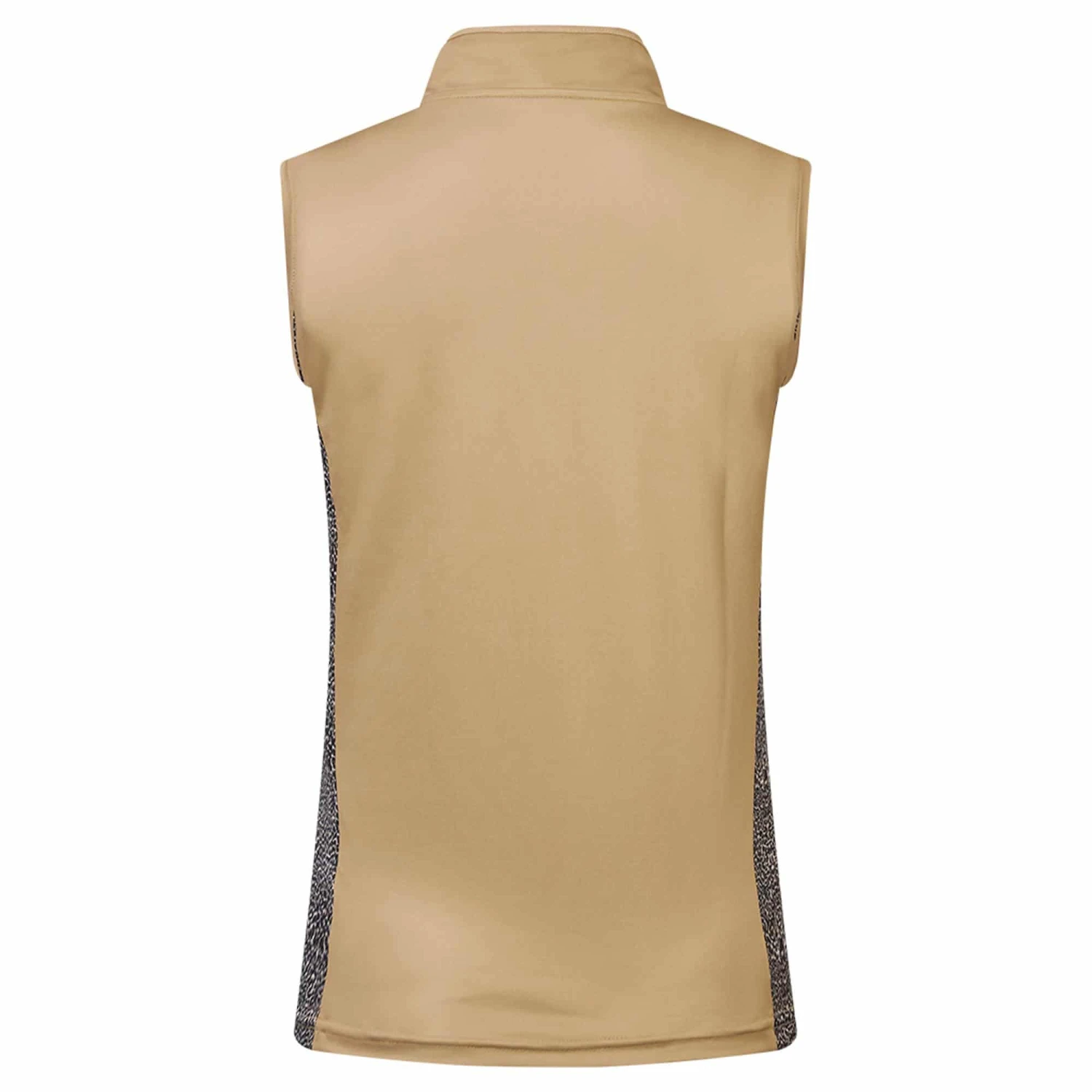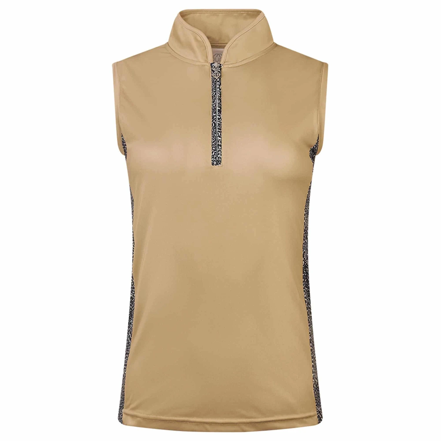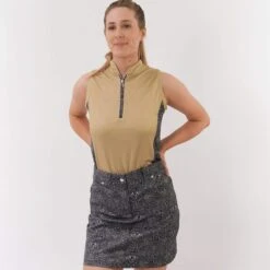 Elise is a partially printed sleeveless polo shirt made from anti-static, anti-crease, 4 way stretch and quick drying fabric with built in UVA+UVB sun protection with UPF 35 to block harmful rays on the course