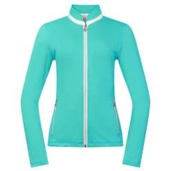 The Pure Golf Mist ladies golf jacket in ocean blue is an essential summer weight mid layer jacket, perfect for milder spring days as well summer mornings & evenings. The full-length zip ensures it easy to take on and off whilst the stretch fabric combines comfort & freedom of movement to ensure it is easy to swing in so you are not restricted while playing. This midlayer has been specifically designed to integrate seamlessly with other garments in the SS23 range and co-ordinates well with white, blue & a variety of other tops to provide a must-have summer look!
