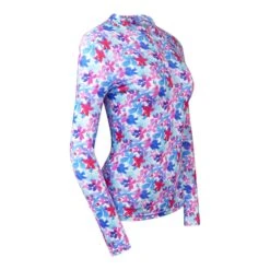 The Pure Golf Serenity midlayer is a versatile full print long sleeved mid/baselayer top with a quarter zip from the spring/summer 23 collection. Made from signature anti-static, anti-crease, 4-way stretch & quick drying fabric with built in UVA+UVB sun protection to keep harmful rays away. This versatile midlayer can be worn as a base layer by those looking for extra coverage or thrown on as a mid-layer on breezy summer golf days – the choice is entirely yours! The Serenity mid-layer co-ordinates perfectly with a wide range of garments from the SS23 collection including shorts, skorts, trousers & accessories.