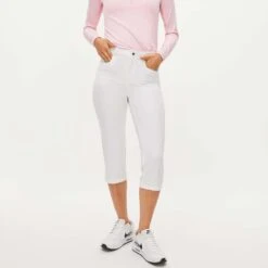 The classic Röhnisch 4-way stretch Chie Comfort ladies golf capri shorts have a classic high waisted fit that is both comfortable and stylish whether worn on or off the golf course. Featuring front pocket design, complete with zip and button fastening the Chie comfort capri is cut in a regular fit with slim legs for a stylish look. This versatile ladies golf capri is sure to become a golfing staple garment this season as they are extremely comfortable to wear and flattering for all sizes. Pair with a polo from this seasons Röhnisch ladies golf clothing collection for a statement look. Made from 86% recycled Polyester – the Chie comfort capri are a sustainable choice