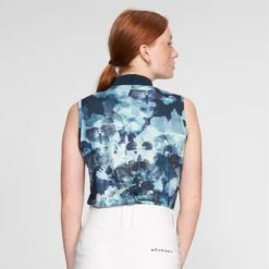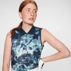 Röhnisch Direction Blue Utopia Polo in an attractive seasonal watercolour print . The Regular fit Direction Poloshirt is made from functional, moisture wicking recycled microfibre material designed to keep you cool and comfortable. The poloshirt has a knitted collar with block colour both front and back and makes a stunning stand alone piece or a beautiful outfit when teamed with the matching Kiana Skort.