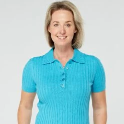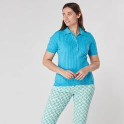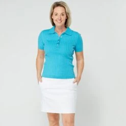 With its super soft feel and bounce back stretch ribbed knit, the Abigail polo from Swing Out Sister is sure to become a favourite this season. The Abigail is a regular fit polo crafted from soft, stretchy material to ensure elevated comfort with no compromise to your freedom of movement whilst you swing. Pair the Abigail with a skort, shorts or trousers from this seasons collection for a stand-out look that’s sure to become a go-to on the fairways.