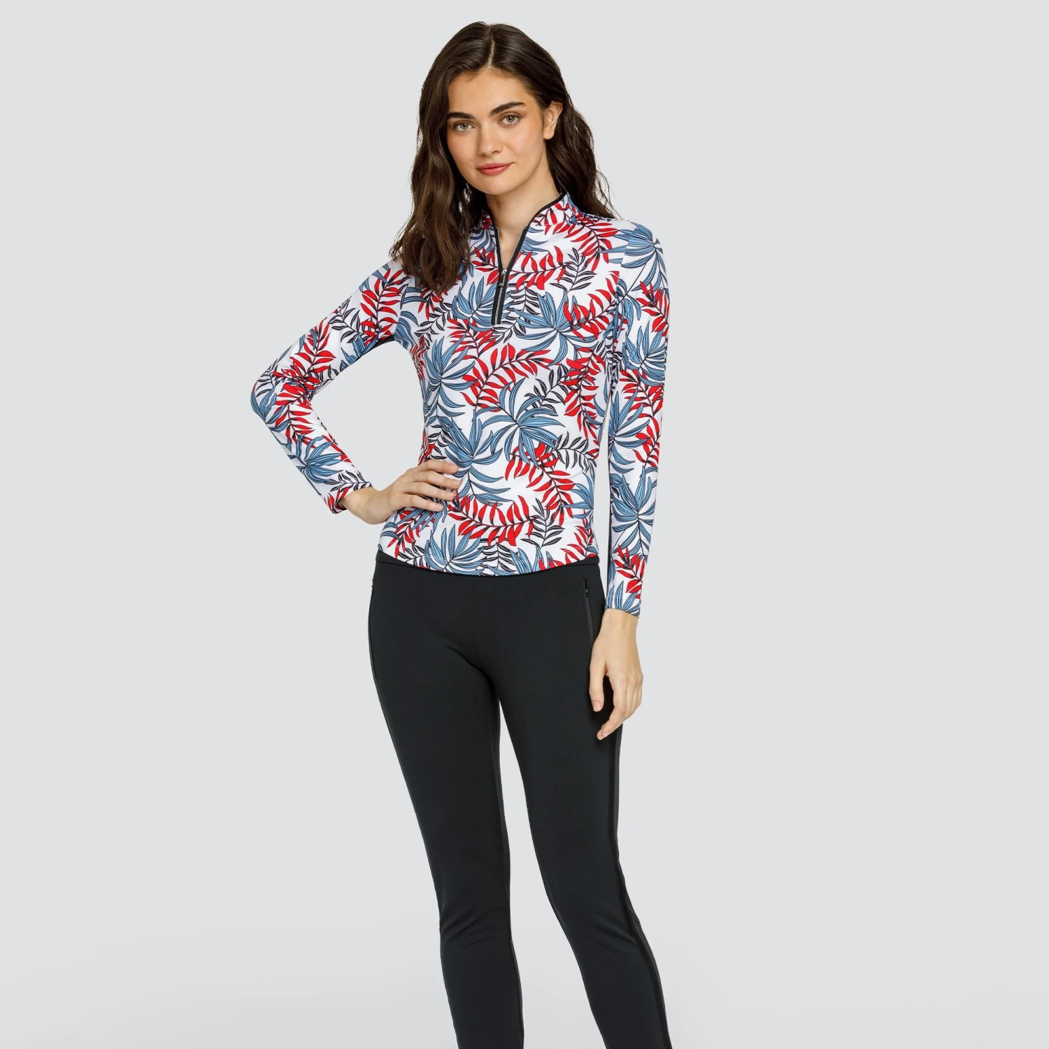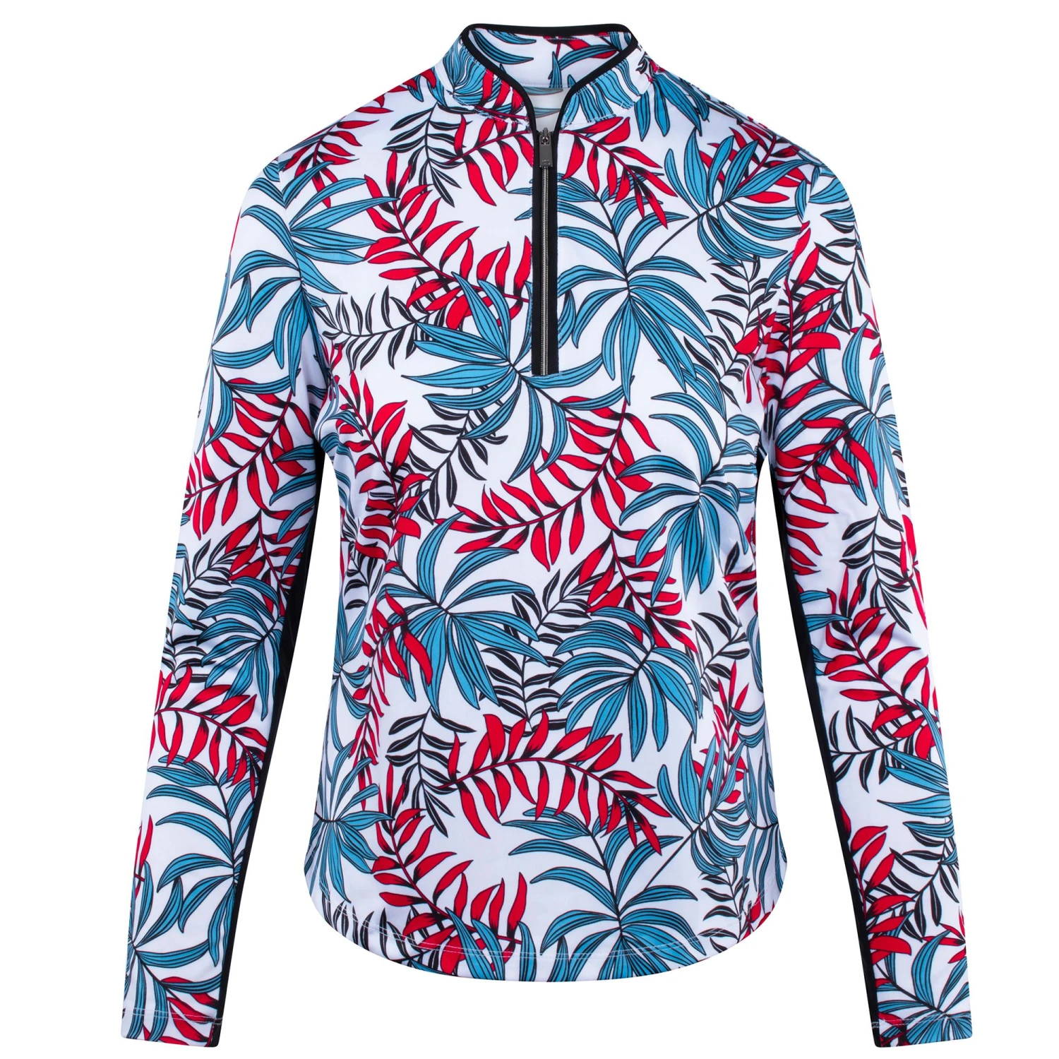 - Quarter-zip long sleeve golf top with mandarin collar, undersleeve inserts, and curved hem